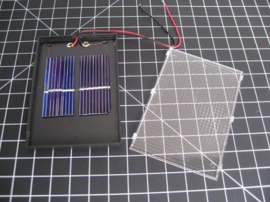 الخلية الشمسية 6 فولط تأتي مكونة من خليتين داخليتين كل واحدة بجهد 3 فولط وموصلة على التوالي. سوف نقوم بتغييرهما ليصبحا موصلين على التوازي. سنستخدم مفكا لرفع الغطاء البلاستيكي الشفاف وكماشة لقطع الحواف حول الخلايا.