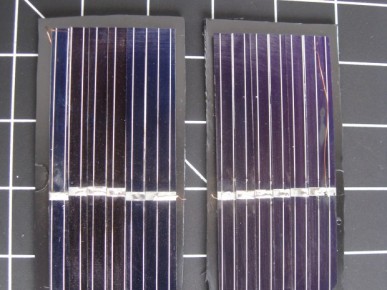 الخلية الشمسية 6 فولط تأتي مكونة من خليتين داخليتين كل واحدة بجهد 3 فولط وموصلة على التوالي. سوف نقوم بتغييرهما ليصبحا موصلين على التوازي. سنستخدم مفكا لرفع الغطاء البلاستيكي الشفاف وكماشة لقطع الحواف حول الخلايا.