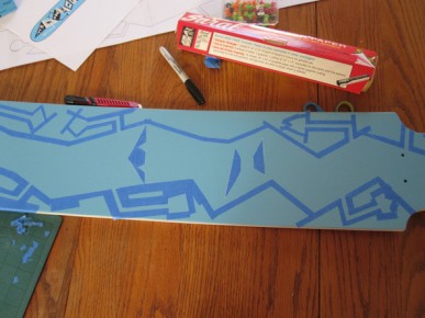 1. قم بتثبيت حاملي الإطارات والأربع الإطارات جيدا أيضا تأكد من أنه مثبت بطريقة مستقيمة وليست مائلة. ملاحظة هامة: بعد تركيب الحاملين والإطارات قم بتجربتها (على طريق مستوى أو على الرصيف) بالصعود عليها فقد يحتاج منك أن تقوم بقص اللوح كما في الصورة كي لا يعيق حركة الإطارات. 2. الآن قم بوضع شريط السيطرة على أعلى اللوح كي يمنع الانزلاق. 3. بعد كل هذا يصبح اللوح جاهزا للاستخدام. 4. بقي عليك تزيينه وتلوينه إن أردت كما في الصور. |